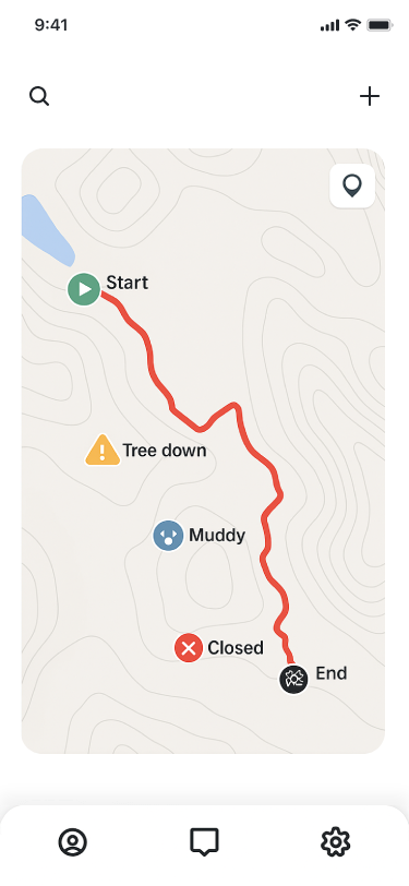 Stay informed with real-time trail updates from the hiking community. Get alerts on muddy paths, fallen trees, closures, and other hazards to help you make safe, informed decisions before and during your hike.