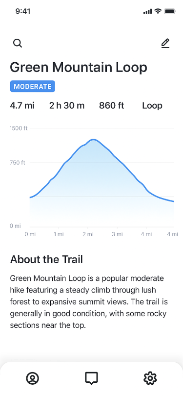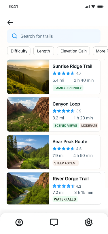 Browse and filter trails by difficulty, distance, elevation, or features. Get personalized recommendations based on your goals, location, and hiking style — from scenic loops to challenging climbs.
