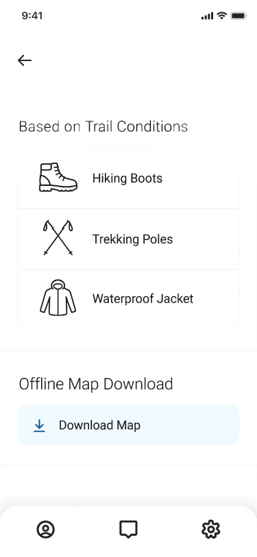 Get personalized gear suggestions based on your trail’s difficulty, weather conditions, and terrain. Whether it’s footwear, layers, or safety tools, pack smarter for a safer adventure.